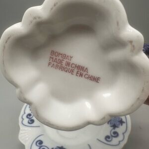 Elegant ceramic creamer with intricate blue floral patterns. Includes matching saucer. Perfect for tea time.