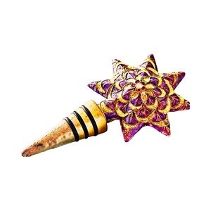Add a touch of elegance to your wine bottles with the Bombay CLOISONNÉ STAR Bottle Stopper. This stunning gold jeweled enameled stopper features intricate detailing and a beautiful purple color that will instantly elevate your barware collection. Not only does it look luxurious, but it also helps preserve the freshness of your favorite wines. Perfect for special occasions or everyday use, this bottle stopper is a must-have for any wine lover.