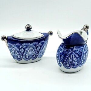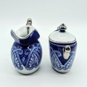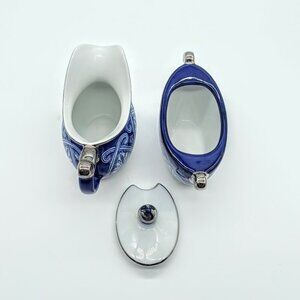 Classic blue and white china covered sugar bowl and creamer pitcher with silver trim from Bombay Company.