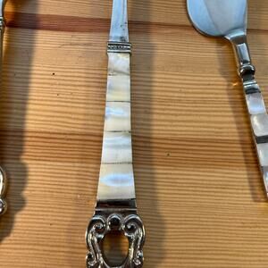 Elegant Bombay Company Baroque Mother-of-Pearl Handle Utensil Set, featuring stunning decorative metalwork and genuine mother-of-pearl inlay handles. These pieces add a touch of luxury to serving, entertaining, or display.