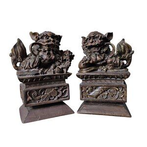 Bombay Company Vintage Wooden Carved Foo Tu Dog Lion Statues Set of 2