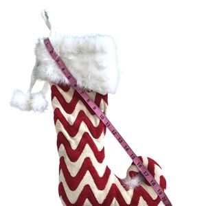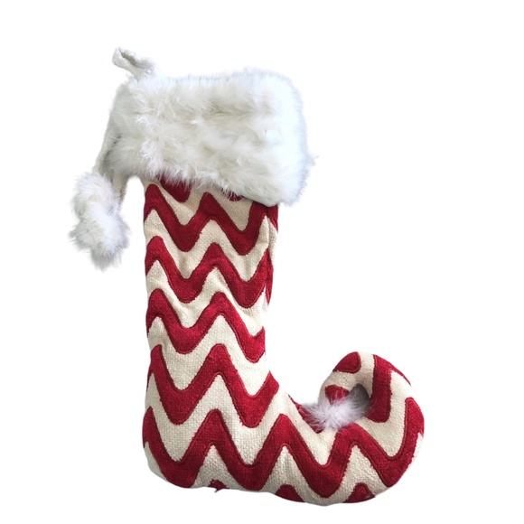 Red and Off-White Chevron Like Stripe. White faux shiny Feather Fur/ cuff. White fuzzy ball at toe and on tie loop ends. There is stuffed batting in foot area. Well made quality stocking.