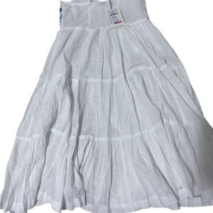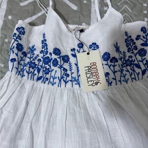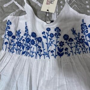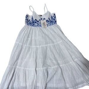 White and blue floral embroidered midi dress with spaghetti straps and tiered skirt #boho #cottage Brand: Bombay Paisley