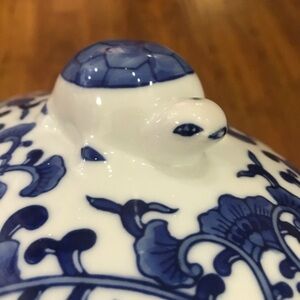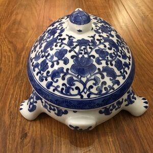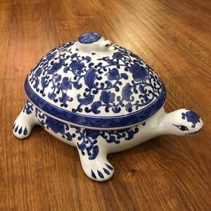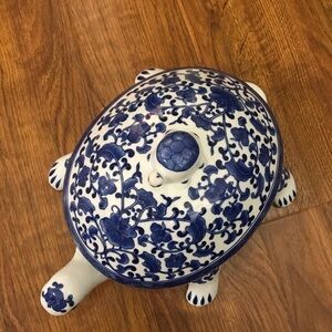 Vintage The Bombay Co. blue and white porcelain floral chinoiserie pottery storage box with lid or tureen. Baby turtle serves as the handle.