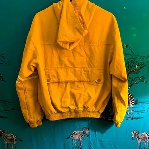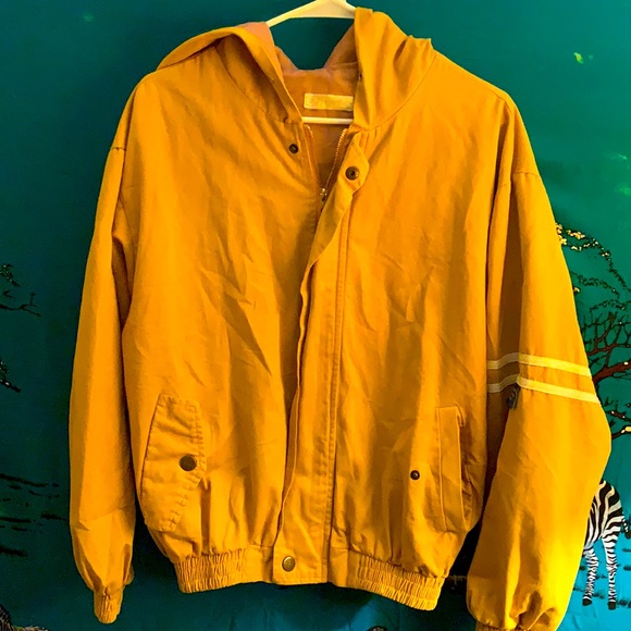 Mustard hooded bomber jacket with soft pastel pink lining. Full zip with buttoned pockets perfect for that retro look!