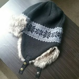 A blue based beanie, buttons on side for extra warmth protection. Never worn.. beautiful print! Great condition!