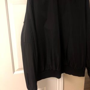 Black jacket with blue on the inside and stand-up collar with zip on the side