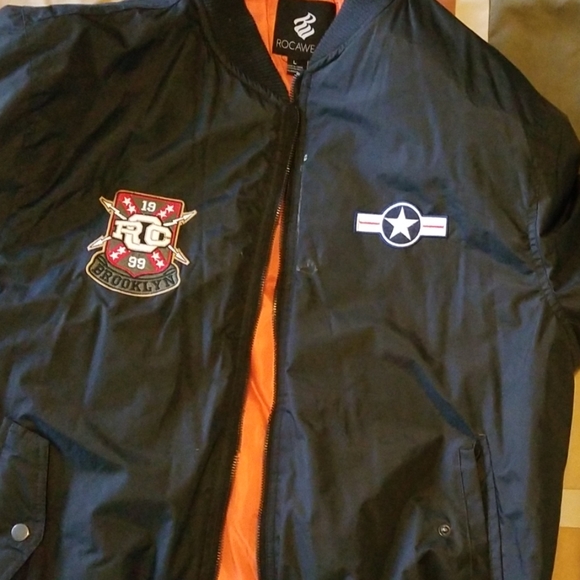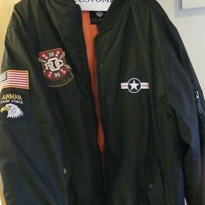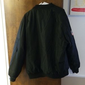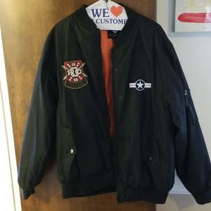 Men's black aviator bomber jacket in great condition. Patches and zipper pockets on sleeve.