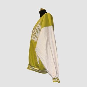 · Chartreuse yellow bomber jacket with white color block with flame accent patches