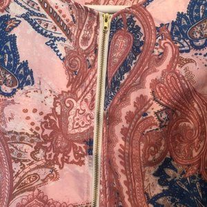 Beautiful Bomber Style Short Jacket in a cute Blue and Pink Bohemian Style Print. Striped detail on the cuffs. No label to indicate maker.