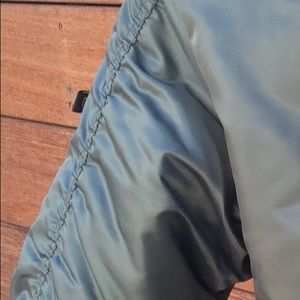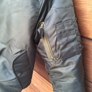 Insulated and built for cool weather or chilly evening out... Nylon army green bomber jacket with bright orange lining.