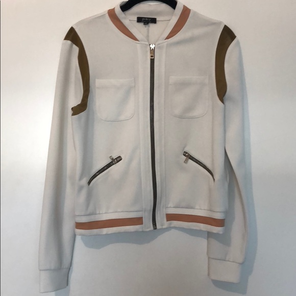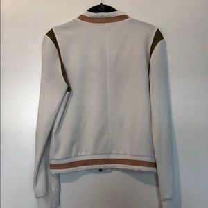 White jacket with nude and army green detail. Faux Zipper pockets add great detail.