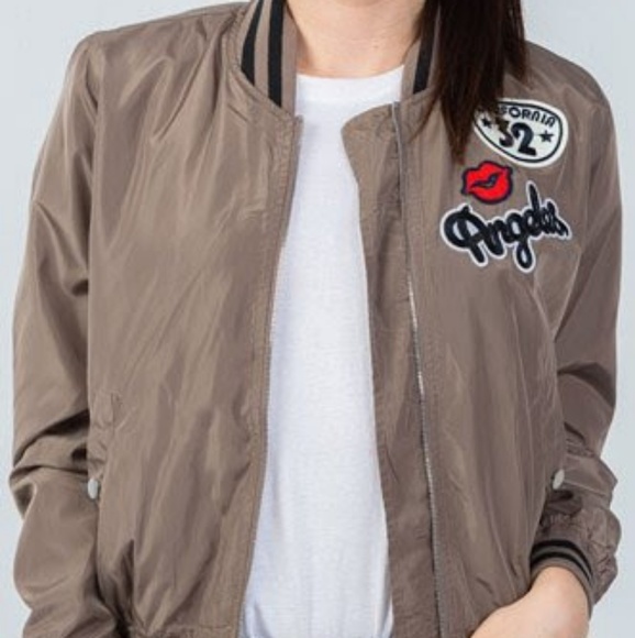 Bomber jacket with patch work featuring slanted pockets, ribbed trim, long sleeves and front zip closure brand new