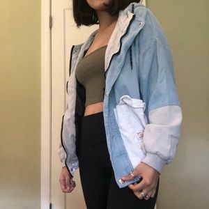 Super cute color block bomber jacket. It does have a tear on the armpit but it isn’t noticeable when it is being worn unless you raise your arm