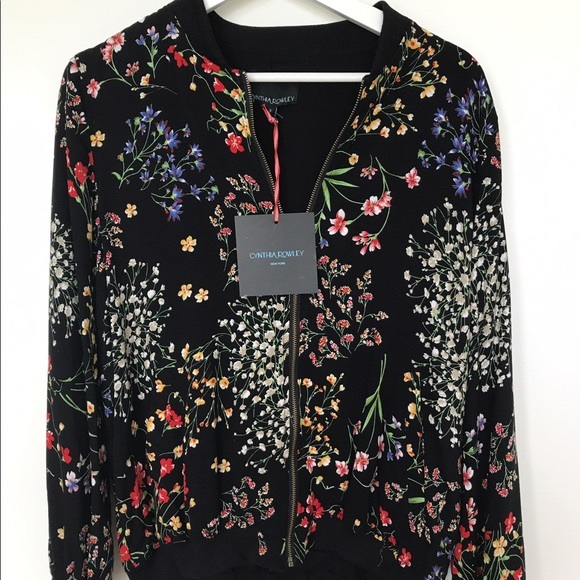 Black bomber with red, yellow and white flower print