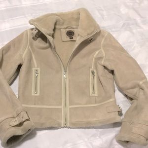 Cream color jacket with zipper pockets.