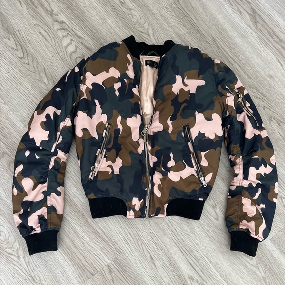 Army print bomber with hints of baby pink and a satin like lining! In great condition, has a few minor flaws as shown in photos!