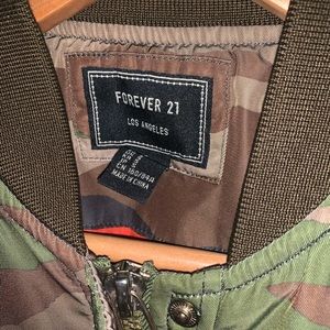 Women’s camo bomber jacket. Super cute. Camp outside and hunting orange inside.. used condition with lots of life left smoke free pet free hone. Bundle n save even more.
