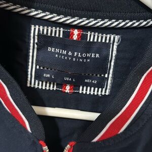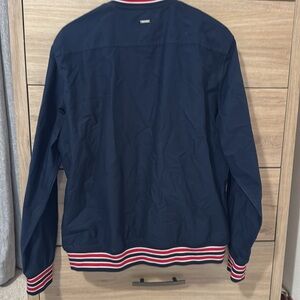 Navy blue over jacket with red as white stripes on collar, sleeves and bottom of jacket. Has a nice stretch to it