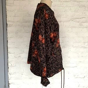Democracy bomber jacket, brown leopard and floral print, zip up, drawstring waist, large (Pit to pit: 21", Length: 25"), gently used, no visible flaws. Pet friendly home