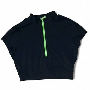 -This sleek black crop top includes a neon green half-zip and short sleeves