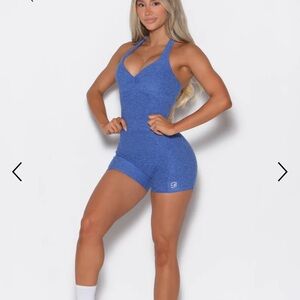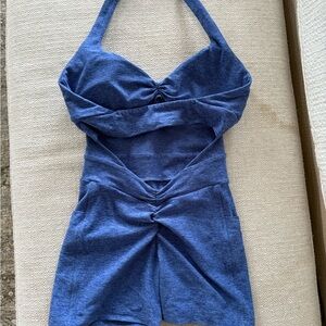 Stylish blue halter bodysuit. Features a flattering fit and soft fabric. Ideal for active wear. Open back with adjustable straps.