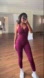 Sleek burgundy jumpsuit. Form-fitting design. Button detail on front. Perfect for active wear.