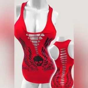 The Holy Hell Bombshell graphic with its eyelashed skull gives this this edgy graphic a girly vibe while the wings give it a free rebel spirit. Its one of our classic hand drawn graphics.