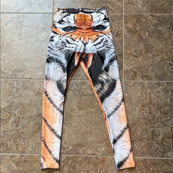 Bold tiger print leggings with vibrant colors. Perfect for a statement look.