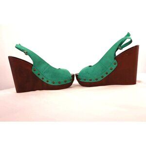 These platform wedge sandals boast a bold green suede upper, blending a vintage-inspired slingback design with modern accents. The studded detailing embellishes the wooden heel, creating a harmonious balance of textures. With their open-toe design, these sandals offer a stylish yet comfortable fit for casual outings or semi-formal gatherings.