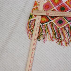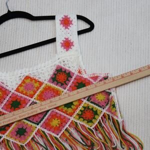 Colorful crochet crop top from the Bomy Collection, featuring vibrant multicolor granny-square design with long fringe hem. Square neckline with wide straps, lightweight and breathable — perfect for summer, festivals, or layering. Made from 95% polyester, 5% elastane. Women’s size Medium. Approximate measurements: 16” pit to pit, 14” length without fringe, 17” including fringe. Excellent pre-owned condition, no flaws noted.