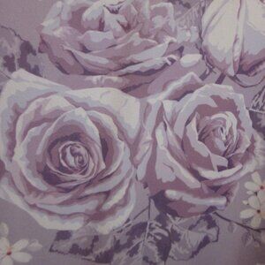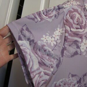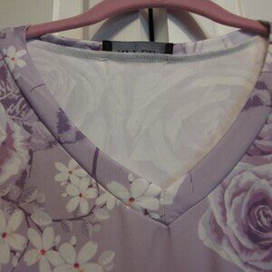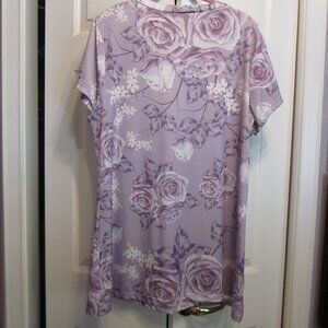 From Bon Apple Tea: Cool to touch poly/spandex knit in size large. V neckline with short sleeves and straight hemline. All over print of large roses in shades of lavender and white. Bust measure 43" and length is 31". Excellent condition.