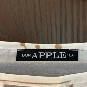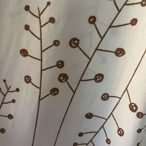 Bon Apple Tea white sleeveless top with tan branch pattern. V neck has band across for decoration. Last pics show some marks that are part of the pattern. Size 2X. The length measures 31.5 inches.