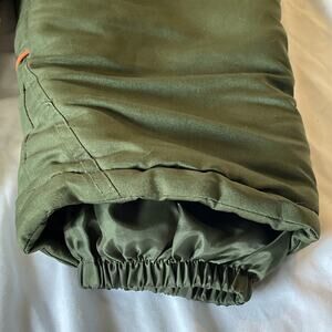 Bon Bebe insulated toddler size 4T puffer snowsuit ski bibs in army green color with orange accents. Features front zipper, two front pockets and elastic at bottom leg for fit. Warm suit for playing in the snow!