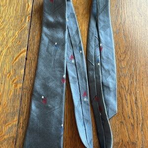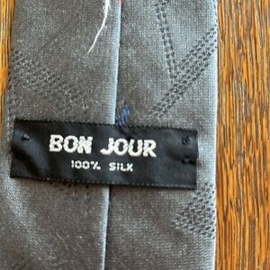 Bon Jour 100% Silk Tie Gray with Blue and Red Hearts Stitching Detail.