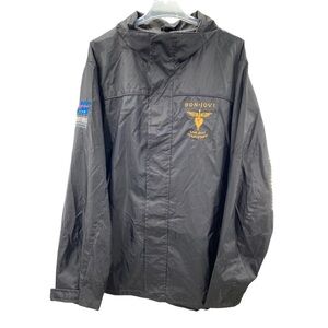 Made by North End. Nylon shell. Polyester lining. Full zipper with velcro covering. Front pockets. Embroidered your logo on front chest and Bon Jovi band embroidered logo on back bottom. Excellent preowned condition.