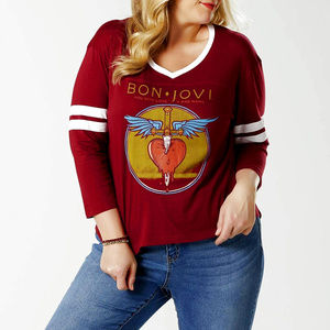 The Bon Jovi "You Give Love A Bad Name" design stands out on the lightweight all-cotton knit design. Football stripes detail the 3/4 long sleeves and a high-low hem provides on-trend shape to this casual tee. 100% Cotton.