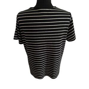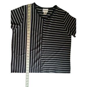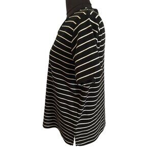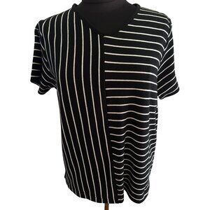This elegantly designed womens shirt from Bon Worth is a symphony of black and white stripes, masterfully crafted to create a striking visual appeal. The juxtaposition of vertical and horizontal stripes adds an element of modern chic to this classic short sleeve style. Perfect for casual outings or a sophisticated layering piece, this shirt offers both comfort and style in one versatile package. In great condition.