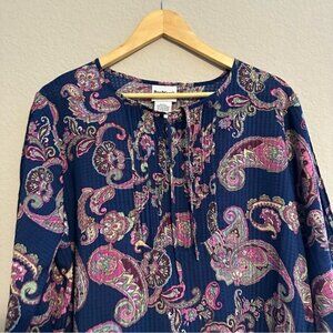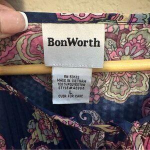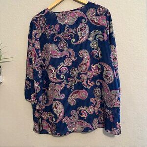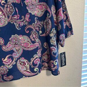 Add a pop of color and timeless charm to your wardrobe with this brand new with tags Bon Worth top. Featuring a rich navy blue background adorned with a bold, vibrant paisley print in pink, green, and ivory tones, this blouse offers both comfort and standout style.