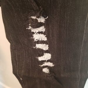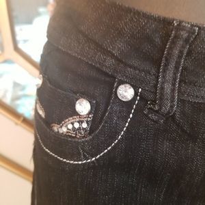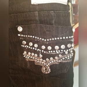 New with tags, black, distressed, new with tags, cuffed, Rhinestones, pockets, belt loops, and plenty of stretch. true to size. view all photos as they are apart of description and contain significant information and is exact item you will receive. May be removed at anytime due to Co listing. Thanks for looking. 1st and last photos are stock photos and are not for sale, remainder photos actual item. 16" inseam