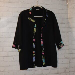 📏 Size: MP (Misses Petite – fits like Medium Petite) 🎨 Color: Black with multicolor floral trim 👘 Style: Open front, long sleeve, lightweight 📍 Condition: Excellent vintage condition
