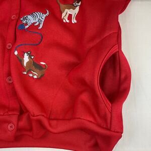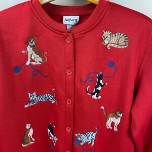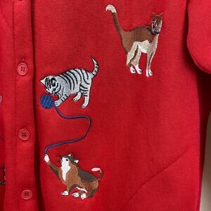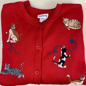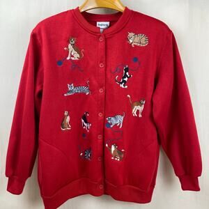 BonWorth Embroidered Cats Red Cotton Cardigan Button Up Sweatshirt w/ Pockets