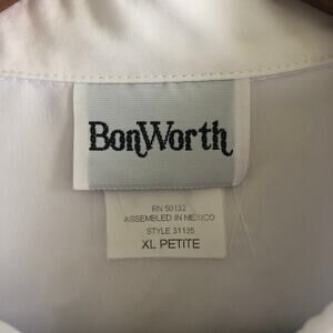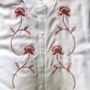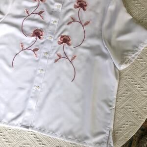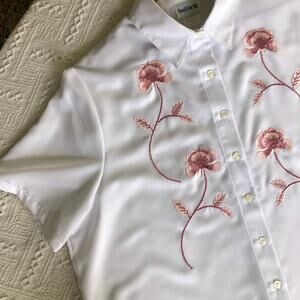 Keywords: BonWorth, Y2K, late 90s, embroidered blouse, floral, cottagecore, grandmacore, button front, short sleeve, polyester, white blouse, petite XL, boxy fit, vintage style, office top, vacation