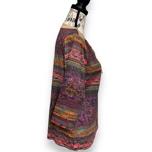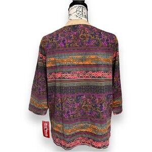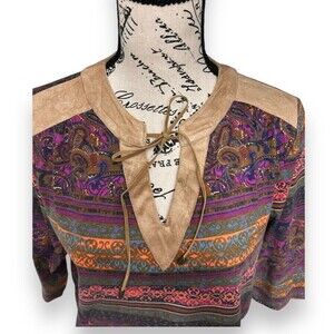 Description: Express your eclectic style with this BonWorth boho paisley blouse featuring a suede lace-up neckline, 3/4 sleeves, and a vibrant multicolor palette. NWT and ready to brighten your day!
