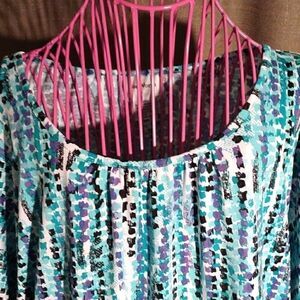 This Bon Worth blue, black, white and purple abstract design tunic blouse is a size LP (large petite). Has full sleeves. 95% polyester 5% spandex and machine washable. Pre-owned and in excellent condition. All offers welcome.