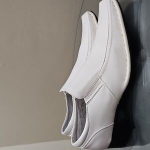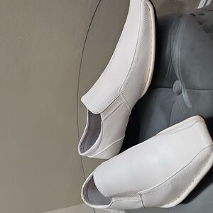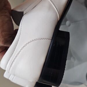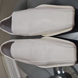 Bonafini men's square toe, sleek white loafers. Small peeling on inside heel of one shoe. Glue discoloration on bottom as shown.