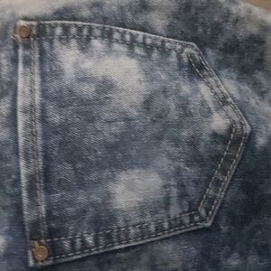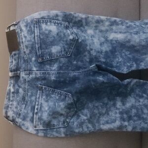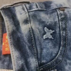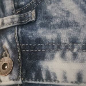 Bonage jeans tye dye tie dye size 3 77% cotton 21% polyester 2% spandex euc preowned false front pockets 2 working rear pockets cool unique pair of fun jeans to make your day better small fabric imperfection as shown mid zipper area probably wouldn't even notice imho 25" waist 10-1/2" front rise 14" back rise butterfly 🦋 cute addition to false pocket area destroyed trough almost looks braided quite the cool look