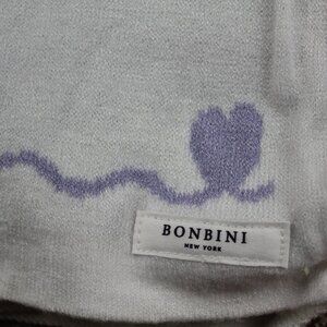 Beautiful baby blanket by the brand Bonbini New York by Stepping Stones. It is brand new with tags! Measures 28"X38". Please note it does have a tiny gray dot on the backside by the purple heart strand, please see photos above. So sweet!