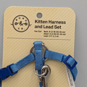 This Bond & Co. kitten harness and lead set comes in blue and is new in package. Designed in one size, it fits necks measuring 8" to 12" and chests measuring 9" to 13". The matching lead measures 4 ft in length, making it a practical and comfortable option for your kitten.