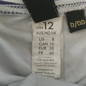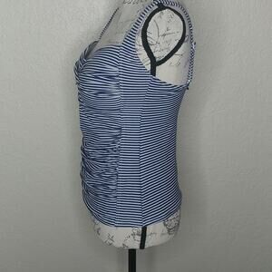 Bond-Eye Australia blue and white striped tankini top with adjustable straps and ruching in the front. Swimsuit top has a built-in bra. Size 12 D/DD. Please see approximate measurements below.